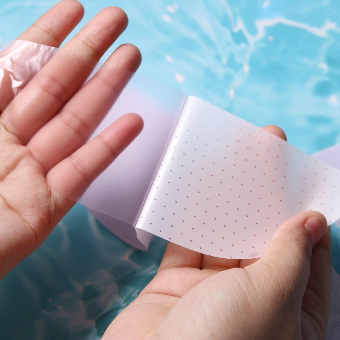 Ultra-thin hydrogel material (0.03mm) formulated with GLYCERIN and PARAFFINUM LIQUIDUM; can absorb 22g essence to form a smooth, skin-fitting film, with long-lasting moisture retention (2-3 hours of wear) and excellent firming & lifting effects
